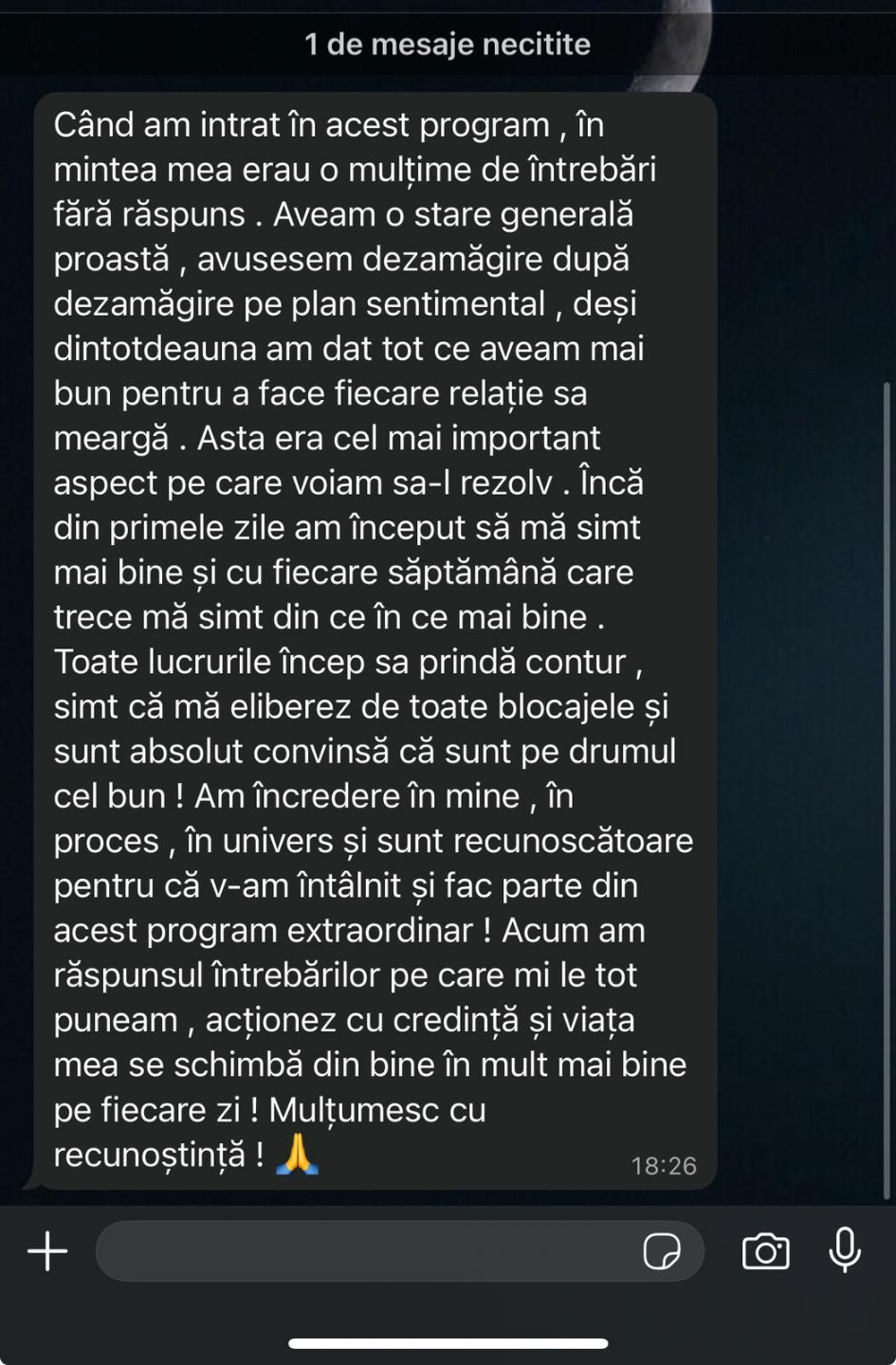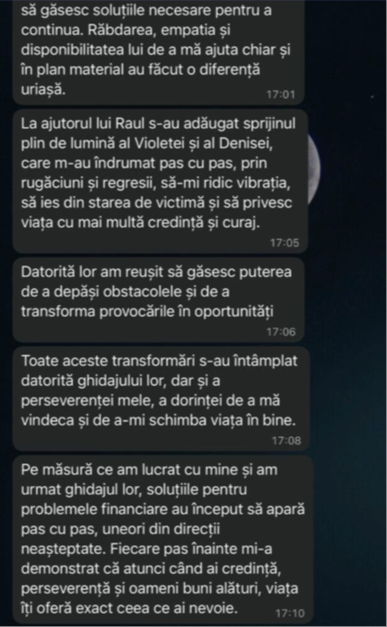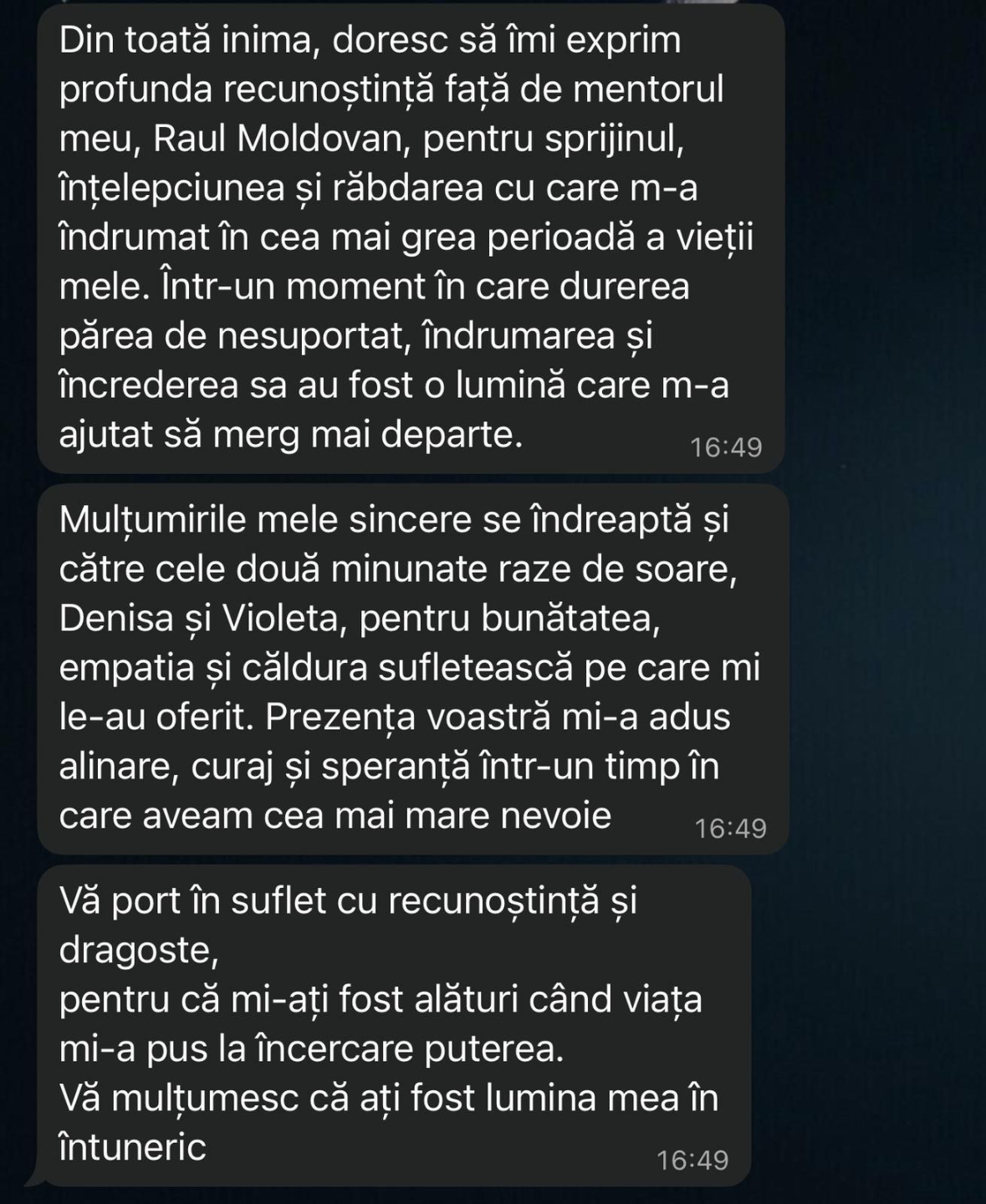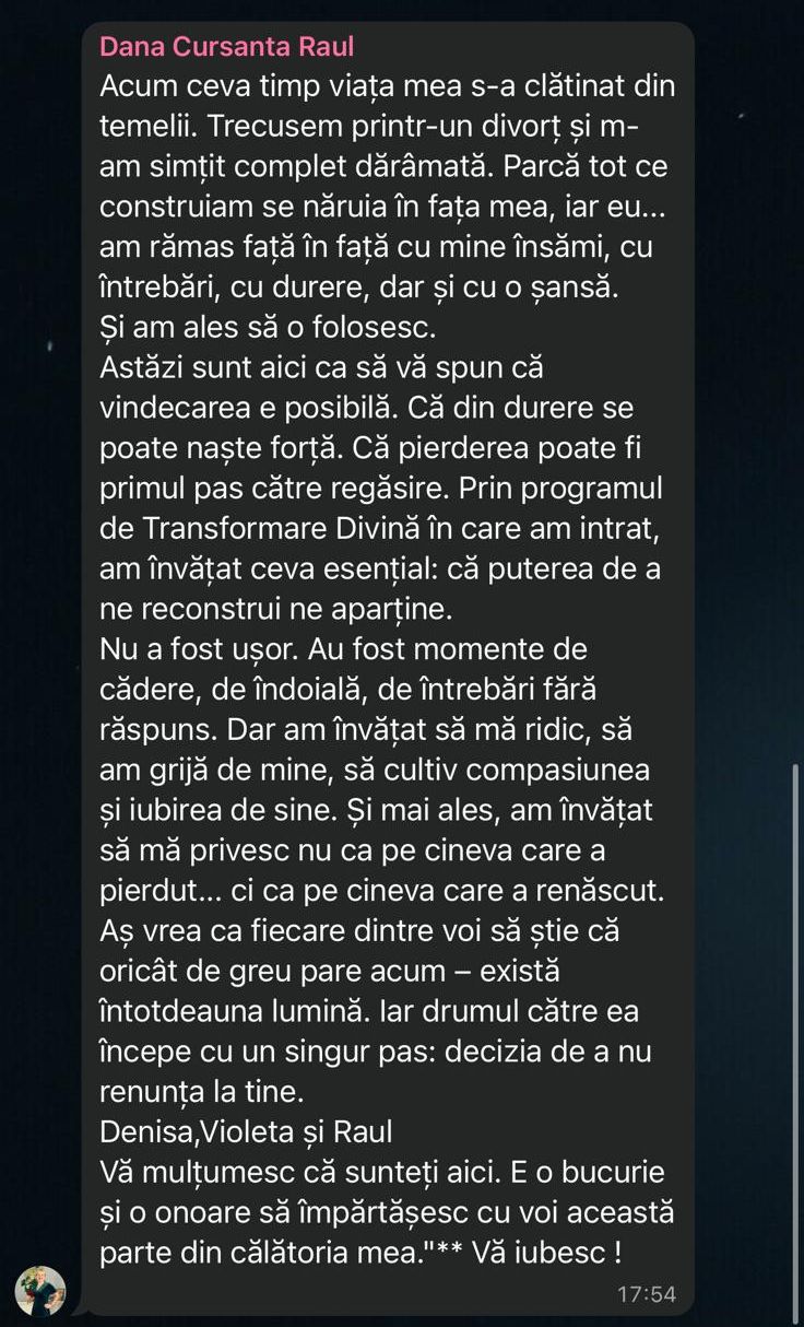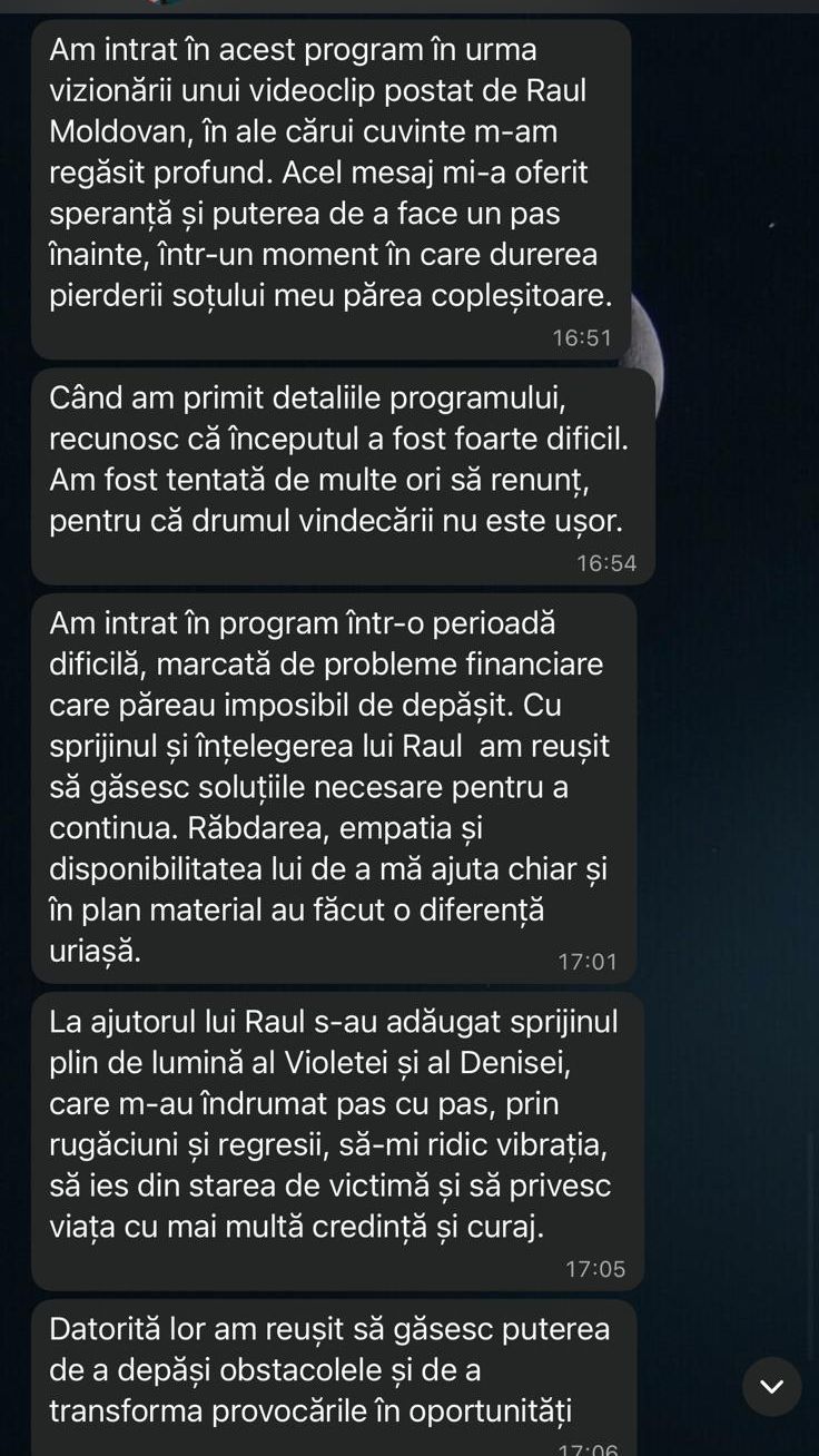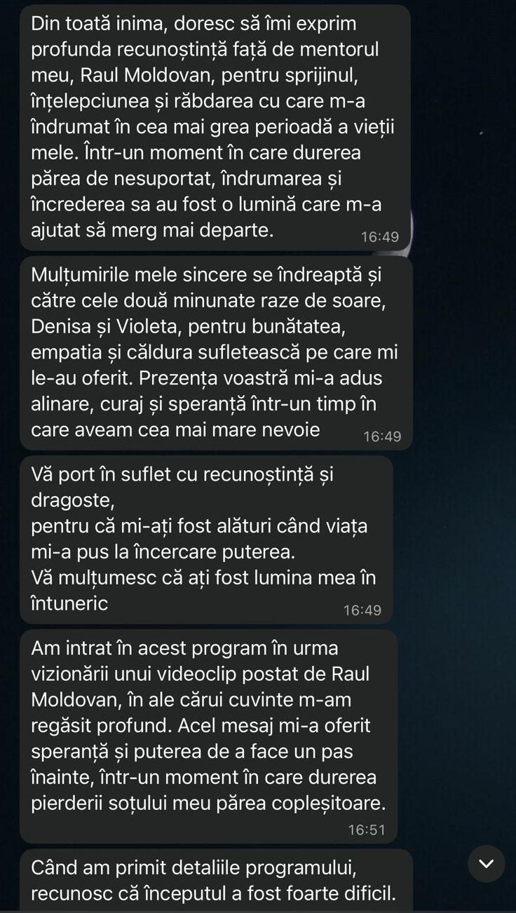 ”Am intrat în acest program în urma vizionării unui videoclip postat de Raul Moldovan, în ale cărui cuvinte m-am regăsit profund. Acel mesaj mi-a oferit speranță și puterea de a face un pas înainte, într-un moment în care durerea pierderii soțului meu părea copleșitoare.”